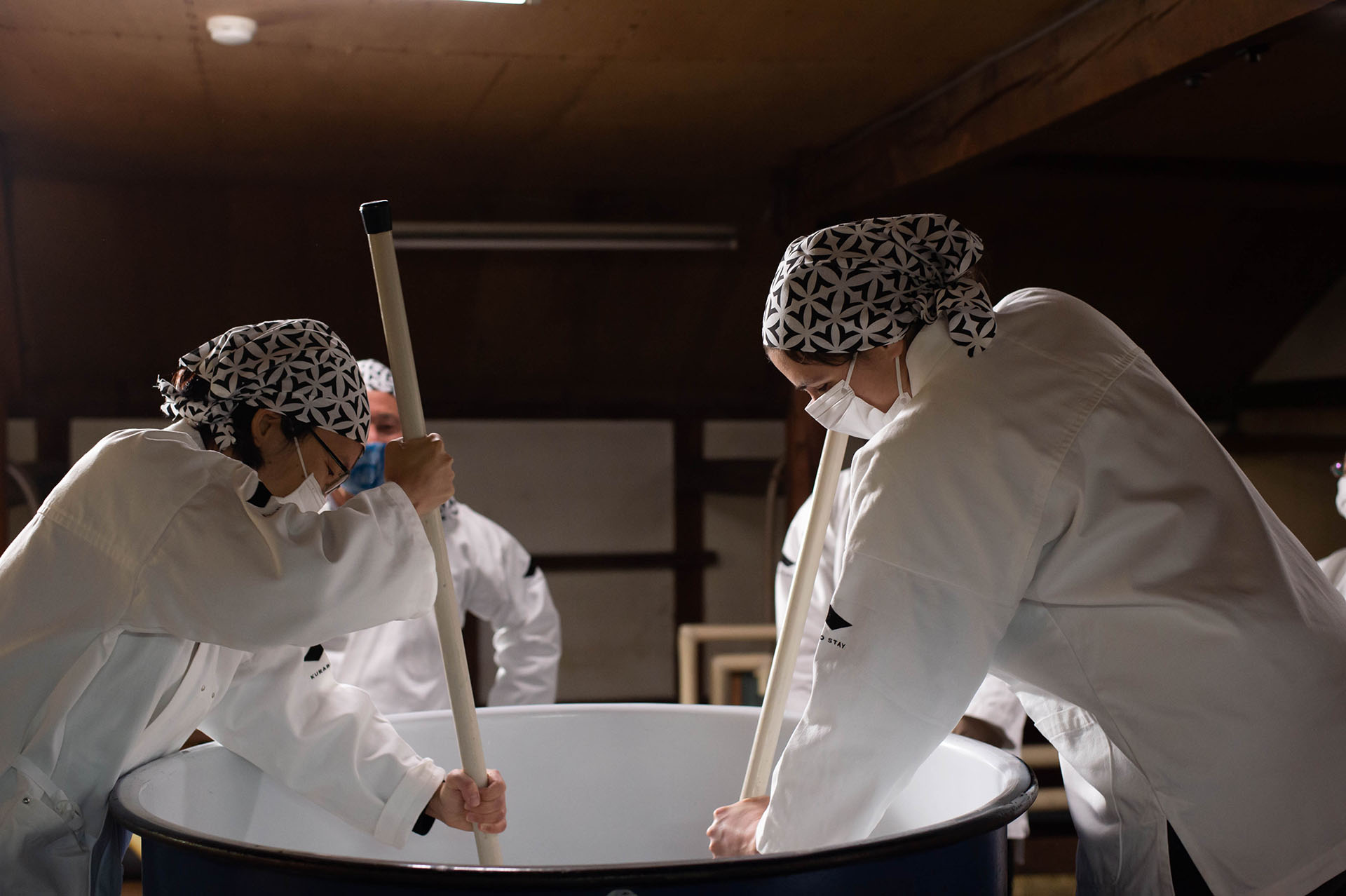 Dans le silence de l’hiver, vous enfilez la tenue blanche des kurabito — les artisans du saké — et participez aux étapes essentielles du brassage : travailler le koji, sentir la fermentation vivante du moromi, écouter le souffle de la cuve comme on écouterait une respiration.